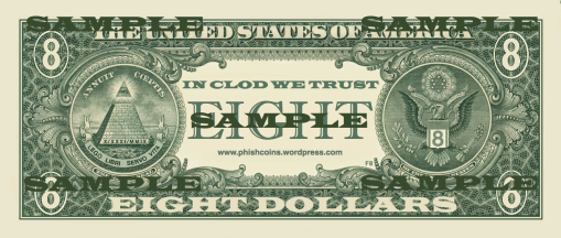 The idea to design an $8 Bill for Festival Eight actually came to me late night ON Halloween, so it is safe to say it was a little late! However, over the past few months, the idea kept popping into my head, so I decided to go for it. The design is based on the $1 Bill, and I tried to work in as much Phish symbolism as possible while remaining true to the original form. Basically anything that I could alter to make the Festival $8 Bill Phishy (in a subtle way) I did.