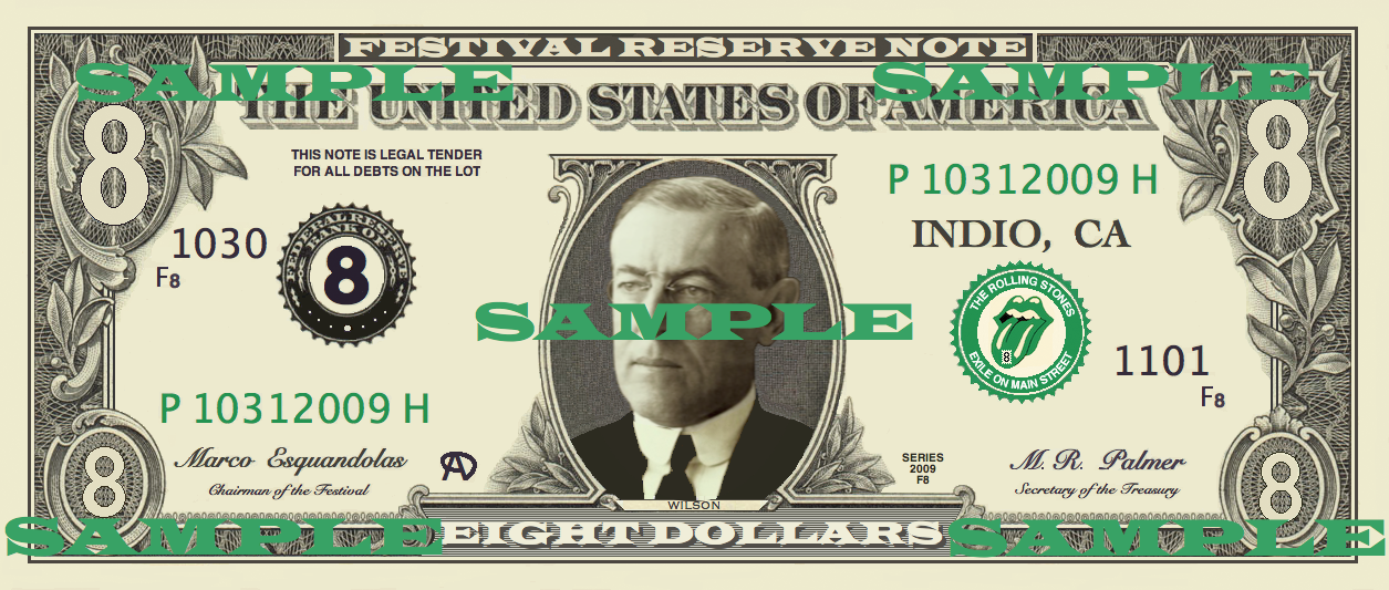 I originally wanted to use a visage of King Wilson, and then it hit me that Woodrow Wilson was on the now defunct $100,000 Bill, so it seemed like a nice touch. I also changed the letter in the middle of the Federal Reserve Seal to an 8, and the city of printing has been changed to Indio, CA. I changed the other serial numbers to F8 and 1030 and 1101 to represent the other two days of the festival. In Clod We Trust needs no explanation, does it?