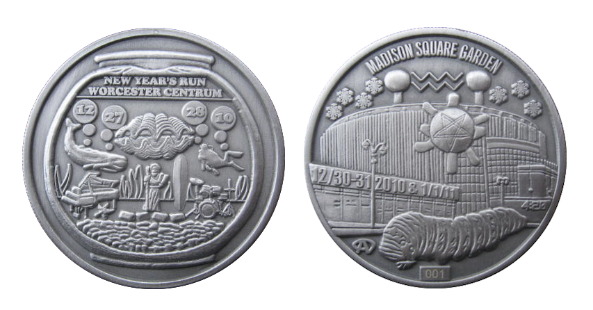 The 2010 NYE Coin was designed to commemorate this year’s 5 night NYE Run being held at The Worcester Centrum and Madison Square Garden. These are two of the more hallowed venues in Phish history, so I tried to work in as much symbolic imagery as possible relating to past moments in each venue. I focused on trying to work in as much NYE flavor as possible, while maintaining a cohesive design.