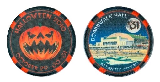 The Halloween Poker Chip was inspired by two things: The fact that I did a Halloween Coin for Festival 8 in 2009 and didn’t want to do another one, and the fact that the 2010 Halloween Run was held in Atlantic City. The Halloween Poker Chip is a casino grade ceramic chip just like those appearing in casinos worldwide. It weighs 10 grams and is 39 millimeters in diameter, both specs matching casino standards. Unlike traditional clay poker chips, ceramic chips have the image embedded into the chip itself… no cheap inlay stickers that can peel or wear away over time!