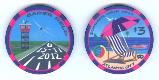 The Bader Field side of the poker chip provides the dates of the run on the runway. King Wilson stands inside the “Control Tower” watching over his kingdom as a Glider approaches the tower on a kamikaze mission conducted by a rebel Lizard. The faces and edge of the Bader Field Poker Chip will be aligned so that the edge spots have a wrap-around effect, and will be casino grade ceramic chips that will last a lifetime.