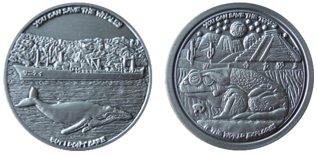 The Humpback Whale seemed like the most appropriate whale for a couple of reasons. First, the Humpback Whale is mentioned in the Phish classic “Bathtub Gin” and it was also the whale that helped to bring global attention to the damaging effects of the whaling industry in the 1960s. The whale side of the Sanity Coin shows a Humpback Whale in cold Arctic waters underneath a Japanese whaling ship. The ship’s name (in Japanese) is “Sanity” and a receding glacier in the background behind the boat to serve as a reminder that the ice caps are deteriorating at an alarming rate.