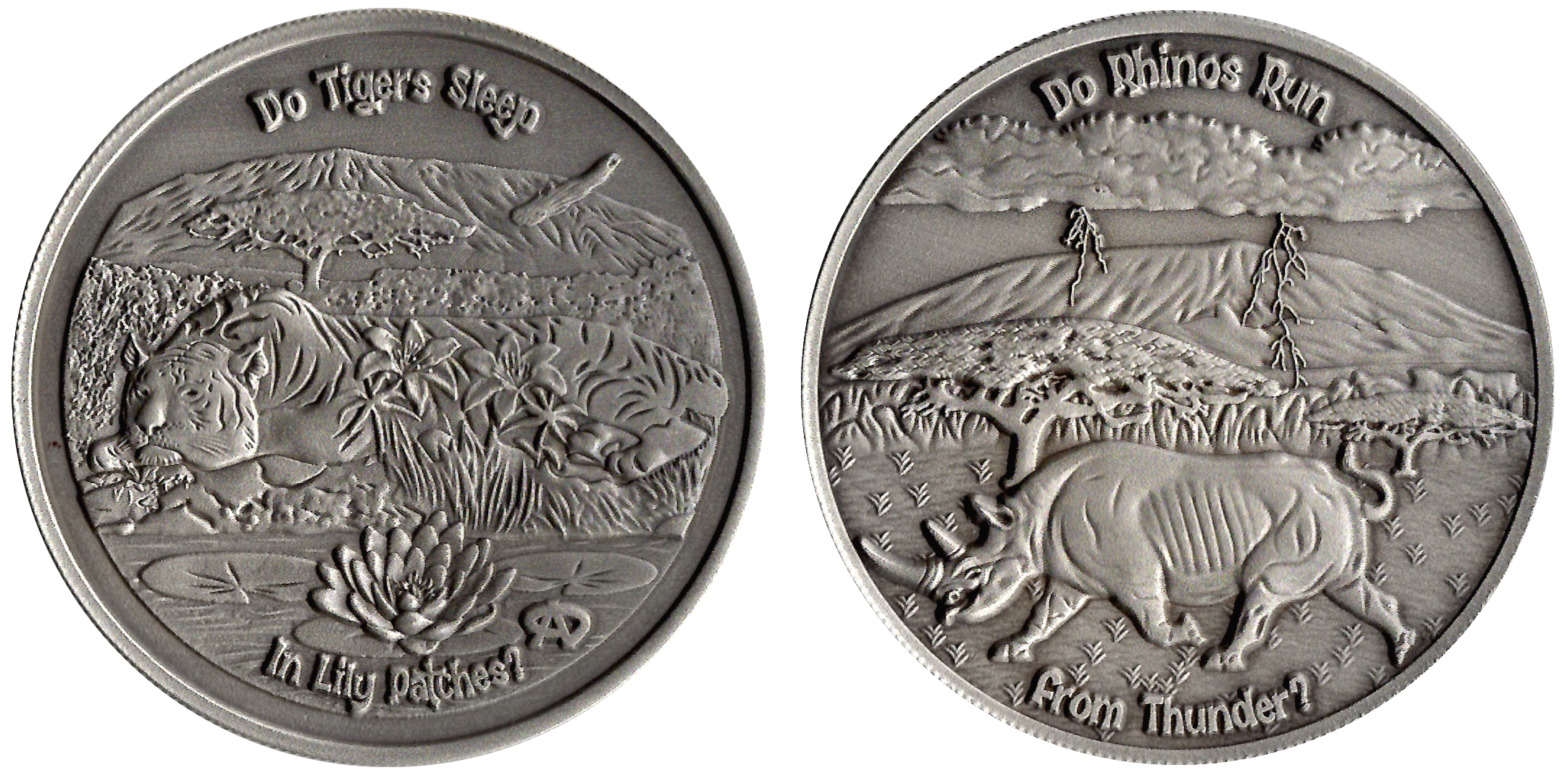 On the obverse side of the Tube Coin, a rhinoceros runs across the African savannah on the other side of Mt. Kilimanjaro from the sleeping tiger. Storm clouds are moving in quickly, and two bolts of lightning are crashing down around the acacia trees, causing the rhinoceros to run for its life.