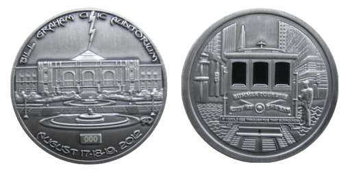 The Bill Graham Civic Auditorium Coin was the obvious choice for a coin commemorating Leg 2 of the 2012 Summer Tour. An historic venue dating to the Roaring Twenties, a 3 night run indoors on Summer Tour… What more could you ask for? I wanted to capture the essence of San Francisco in this coin, which was challenging as San Francisco is such an iconic city.